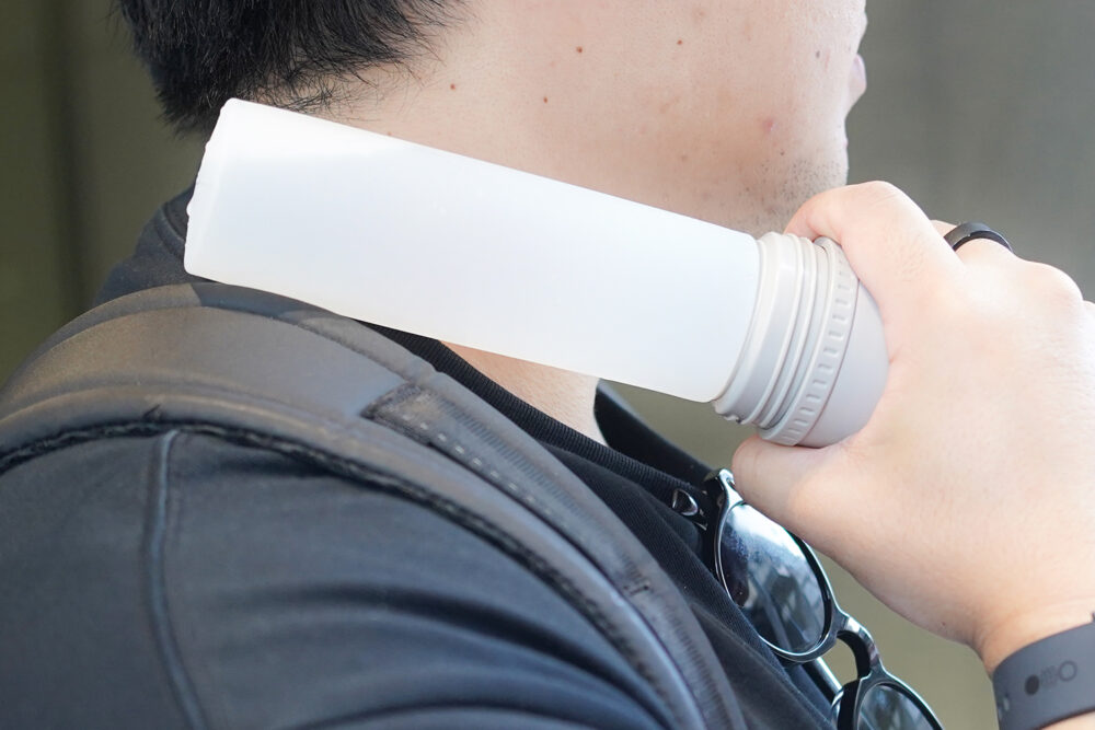 ただ、両手が埋まってしまうため、一番実用的かつ効率的なのは「手持ち」。片手でぐっと握りしめ、もう一方の手はスマホを操作するもよし、日傘を持つのもいいでしょう。ちなみに、通勤や通学の場合は、駅や学校に付いたらボトルに収納すれば、夜まで氷がしっかりと残ります。